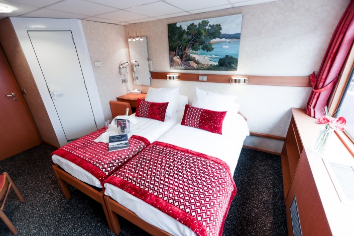Alle kahytterne er komfortable og velindrettede. De varme orange nuancer i indretningen samt det gyldne træværk og lofterne skaber en varm og indbydende atmosfære.